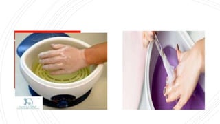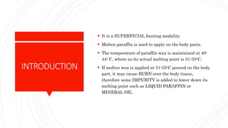 Paraffin wax bath therapy involves applying molten paraffin wax at 40-44°C to body parts using various techniques. The heat from the paraffin wax increases local circulation and skin flexibility while reducing pain and stiffness, making it useful for conditions like arthritis. A paraffin wax bath unit maintains the wax at the proper temperature through a thermostat and container, and the wax must be sterilized regularly to maintain the unit and safely reuse the wax for treatments.