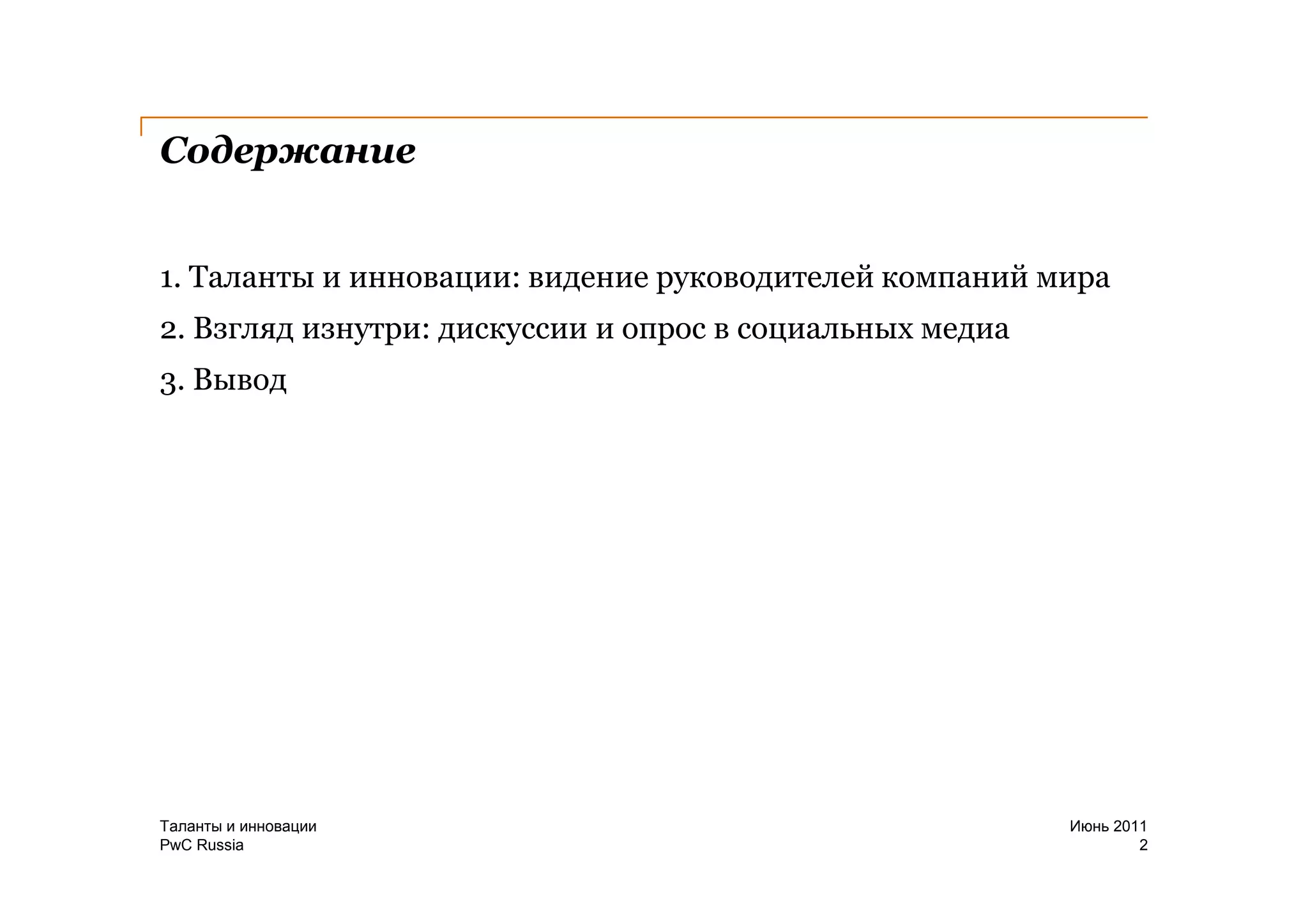 Документ представляет результаты 14-го ежегодного глобального опроса, проведенного PwC среди руководителей крупнейших компаний мира, с акцентом на важность талантов и инноваций для бизнеса. В частности, 83% опрошенных ожидают пересмотра стратегий управления кадровым потенциалом из-за изменений в бизнес-среде, а российские CEO выражают меньшую уверенность в потенциале новых продуктов по сравнению с конкурентами из других стран БРИК. Исследование также обсуждает необходимость привлечения инновационных идей и талантов из-за границы, что подчеркивает сложные условия для реализации инноваций в России.