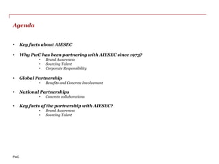 PwC has partnered with AIESEC, the world's largest student-run organization, since 1973 to raise its brand awareness among students, source talent for internships and jobs, and support corporate social responsibility efforts. The global partnership provides benefits like opportunities for workshops, networking, and recruiting at AIESEC events. At a national level, PwC firms collaborate with local AIESEC chapters through conferences, career fairs, alumni initiatives, and more. Over 50 interns join PwC annually through AIESEC, and 85% of those interns are retained after their internships. The longstanding partnership exposes the PwC brand to over 54,000 AIESEC student members.