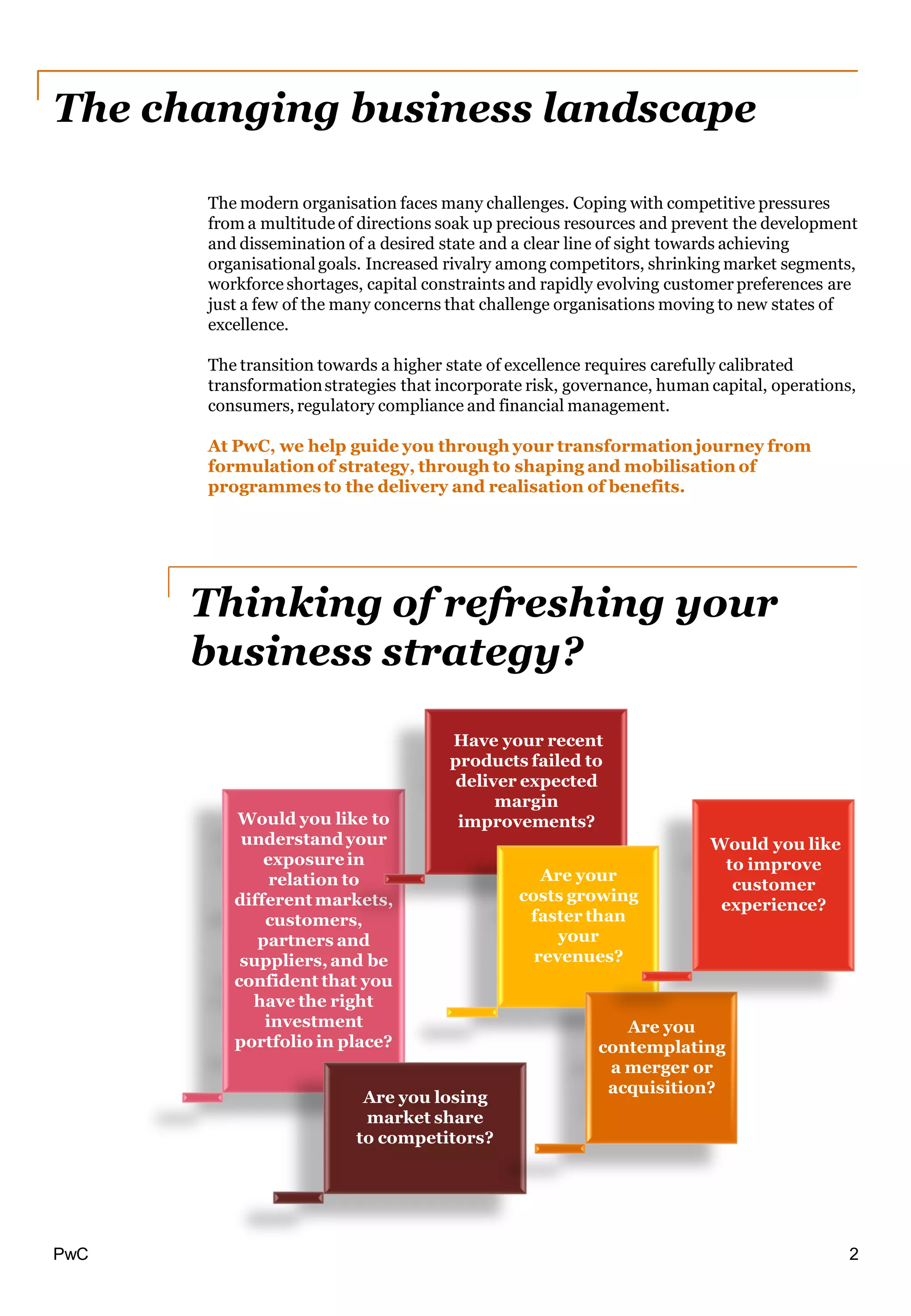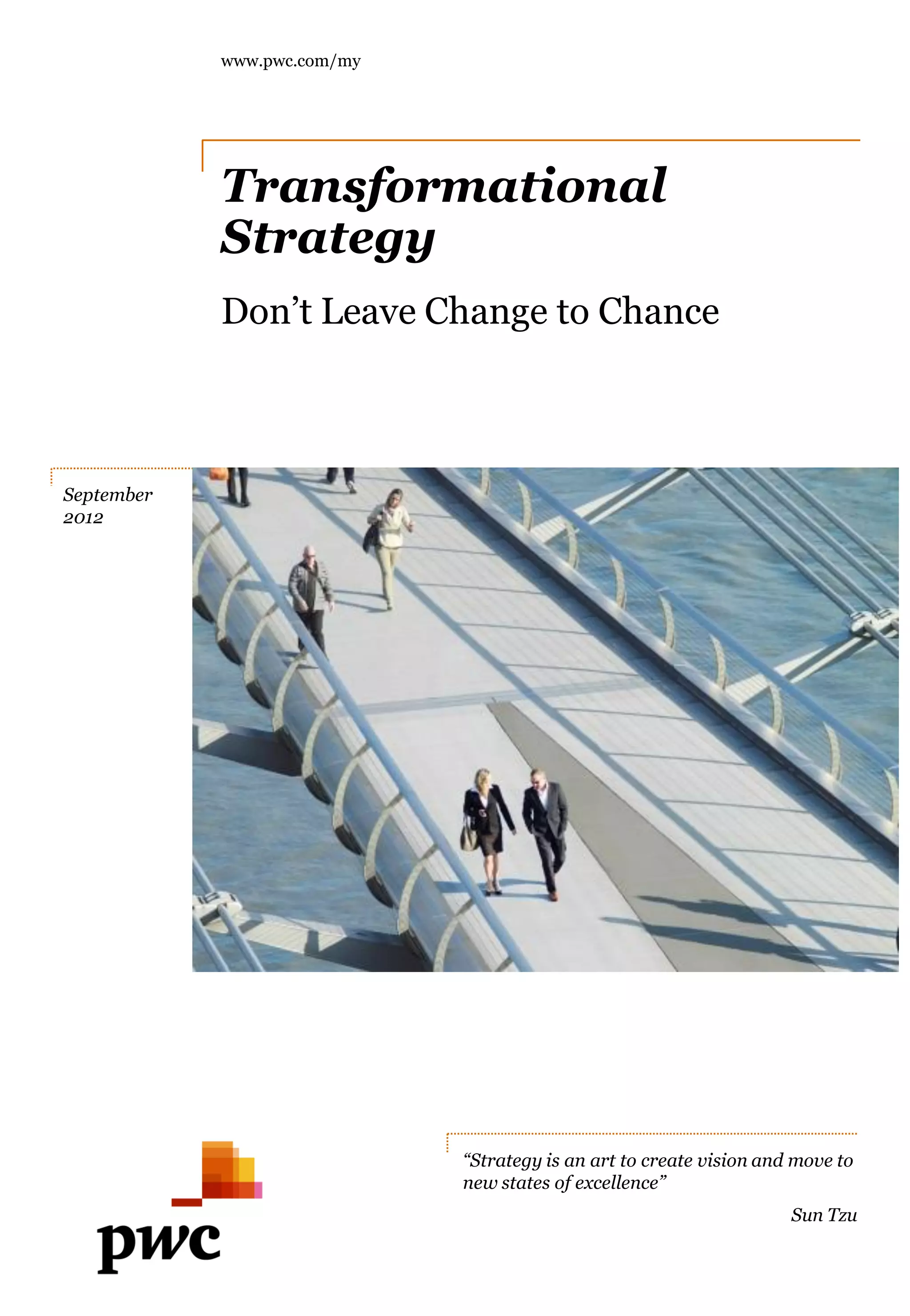 This document from PwC discusses transformational strategy and how they can help organizations through transformation journeys. It provides an overview of the challenges modern organizations face and how carefully calibrated transformation strategies are needed. PwC offers services to help organizations formulate, validate, and implement strategies from developing business cases to strategic planning to change management. The document includes examples of work PwC has done with clients and profiles some of PwC's team members with relevant experience.