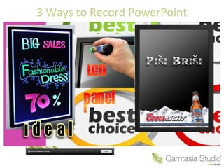 The document describes 3 ways to record a PowerPoint presentation within PowerPoint using Camtasia Studio by setting up the Camtasia recording toolbar, clicking record to launch the slideshow and control it during recording, and having the options to stop or continue recording and then produce or edit the recording. It also provides instructions for cancelling a recording in progress by pressing Esc, clicking cancel on the save prompt, and confirming the deletion of the video capture.