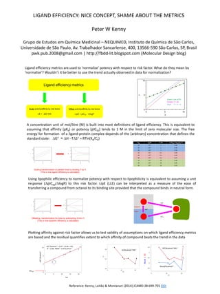 The document discusses issues with commonly used ligand efficiency metrics. It argues that ligand efficiency metrics make assumptions about how affinity relates to risk factors like lipophilicity that may not reflect actual trends in data. Specifically, it notes that ligand efficiency assumes affinity increases linearly with decreasing molecular size or lipophilicity, when data analysis could reveal different trends. The document also discusses how the choice of standard state concentration in definitions can impact values. It suggests plotting affinity against risk factors to test assumptions and better normalize potency.