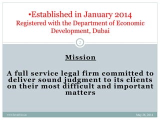 Professional World Management & Legal Consultants, established in January 2014 in Dubai, offers a full range of legal services including litigation, commercial law, civil law, criminal law, family law, and intellectual property. The firm is spearheaded by partners with extensive legal expertise, focusing on areas such as company formation, contract execution, and dispute resolution. They are committed to delivering robust legal solutions while ensuring compliance with UAE laws and regulations.