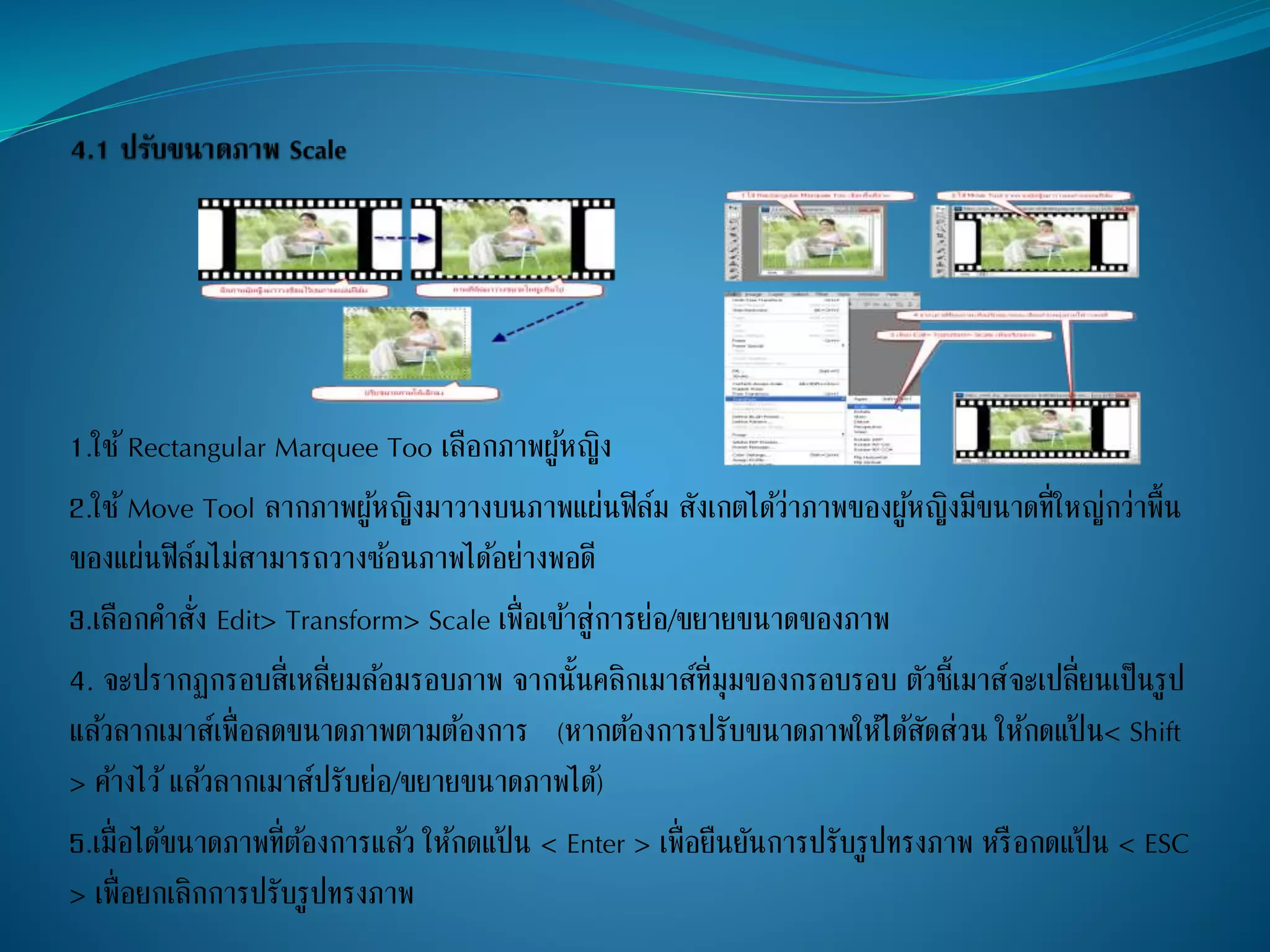 3.เลือกคาสั่ง Edit> Transform> Scale เพื่อเข้าสู่การย่อ/ขยายขนาดของภาพ