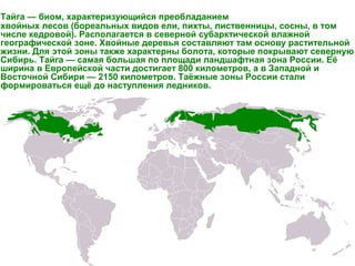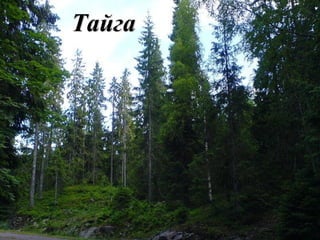 Документ описывает тайгу как биом, характерный хвойными лесами и расположенный в северной субарктической зоне России. В тайге обитают разнообразные животные, и хотя она характеризуется бедным подлеском, здесь присутствуют такие виды, как рысь и белка. Основные занятия населения включают охоту, сбор дикорастущих плодов и лесопромысловое хозяйство.
