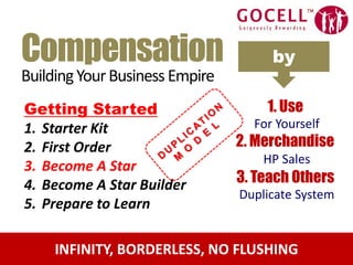 This document introduces a multi-level marketing compensation plan that allows participants to build their business and income. It outlines the following key steps:
