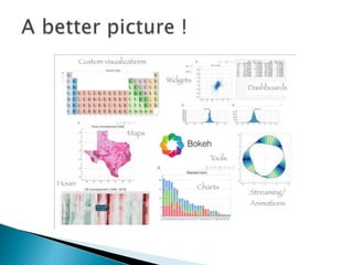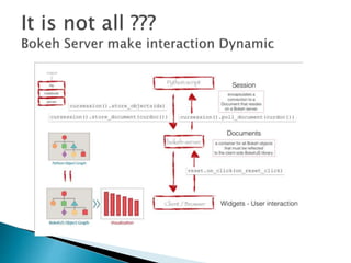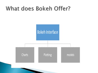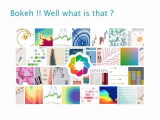 Bokeh is an interactive Python visualization library that targets modern web browsers for presentation. It aims to provide elegant and concise construction of novel graphics in D3.js style, with high-performance interactivity over large or streaming datasets. Bokeh can help create interactive plots, dashboards, and data applications. It outputs JSON files that serve as input for the BokehJS JavaScript library. While it has bindings for other languages, this discussion will focus on Bokeh's Python capabilities, which include basic and advanced charting features. Bokeh can also display plots from libraries like Matplotlib, Seaborn, and ggplot.