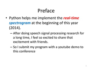 The document details the development and demonstration of 'ryaudio', a real-time audio spectrogram application utilizing Python 3, which is aimed at audio processing and sound-driven games. It includes reviewer feedback, technical aspects of signal processing using FFT, and emphasizes the advantages of programming in one's native language. The author shares insights on real-time processing tools and provides links to the source code and a demo video.