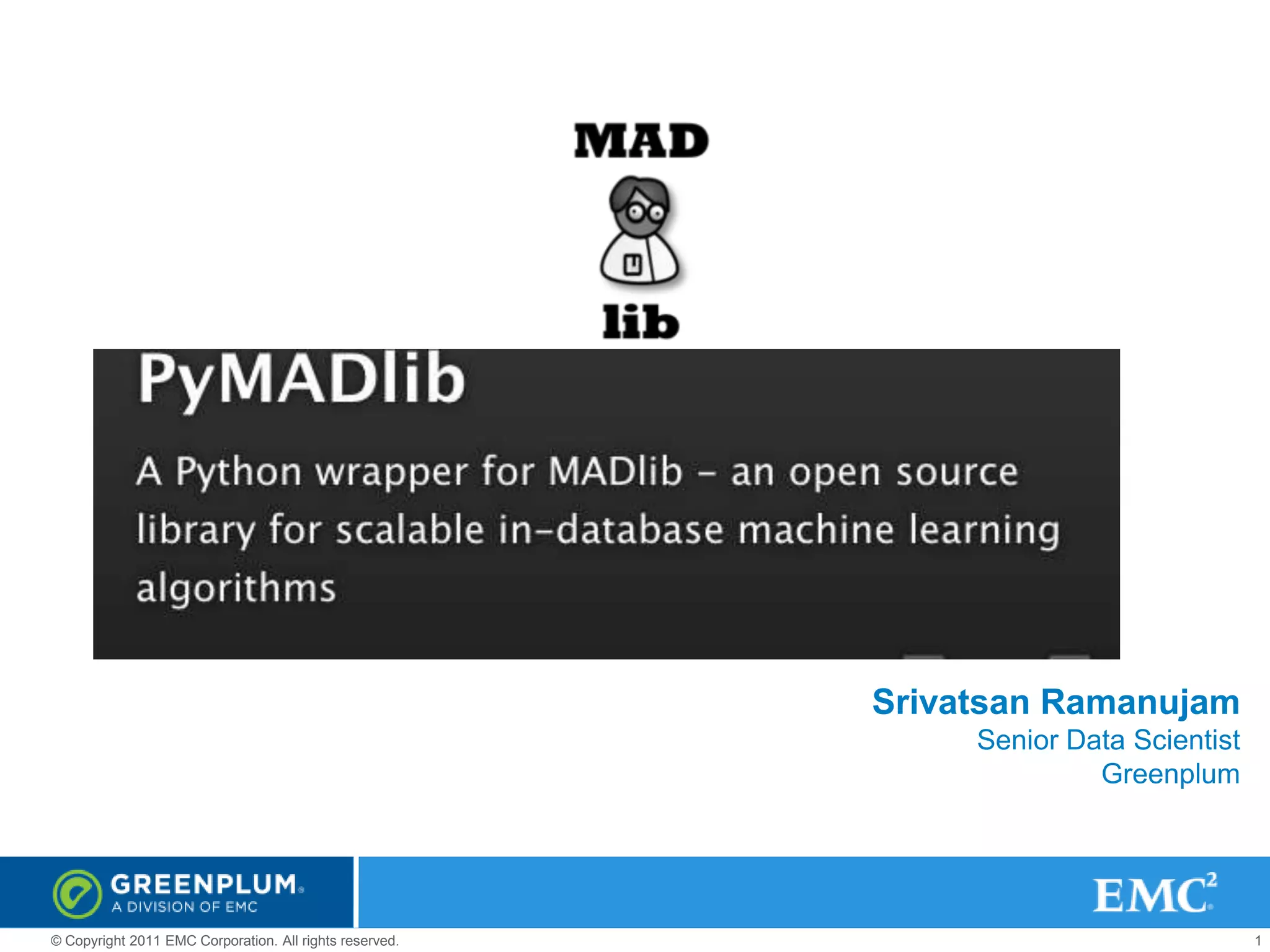 The document provides an overview of Greenplum's Unified Analytics Platform, covering its products like GPDB and GPHG, and introducing Madlib, a project offering machine learning algorithms integrated with databases. It highlights Madlib's architecture, current modules, and performance comparisons with Mahout, as well as introducing pymadlib for Python users. The document also discusses future directions, including HawQ, a parallel SQL engine designed for big data analytics.