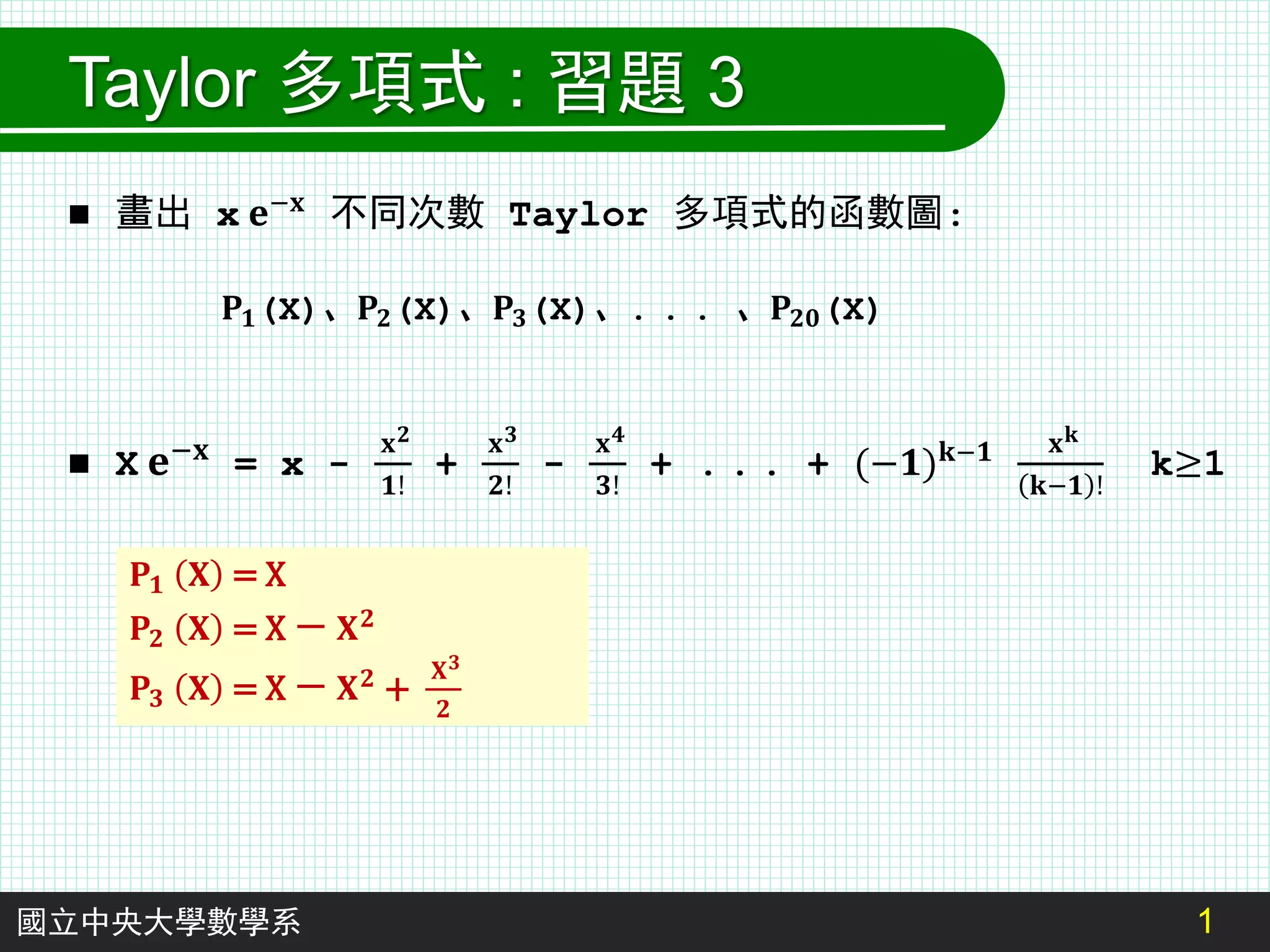 1. The document is about Taylor polynomials for the function x e^-x. 2. It gives the Taylor series expansion for x e^-x and lists the first 20 Taylor polynomials P1(x) through P20(x). 3. Readers are asked to graph the function x e^-x along with its Taylor polynomials of varying degrees to compare how well the polynomials approximate the original function.