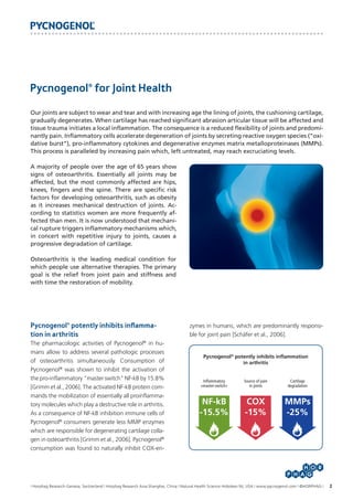 Pycnogenol® is a natural compound that shows significant anti-inflammatory effects on osteoarthritis, inhibiting key inflammatory processes and reducing pain, stiffness, and mobility issues associated with the disease. Clinical trials have demonstrated its efficacy, with participants experiencing substantial improvements in symptoms and a decreased need for pain medications. Overall, pycnogenol® offers a promising alternative for those suffering from arthritis.