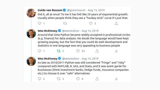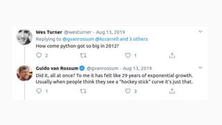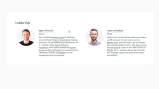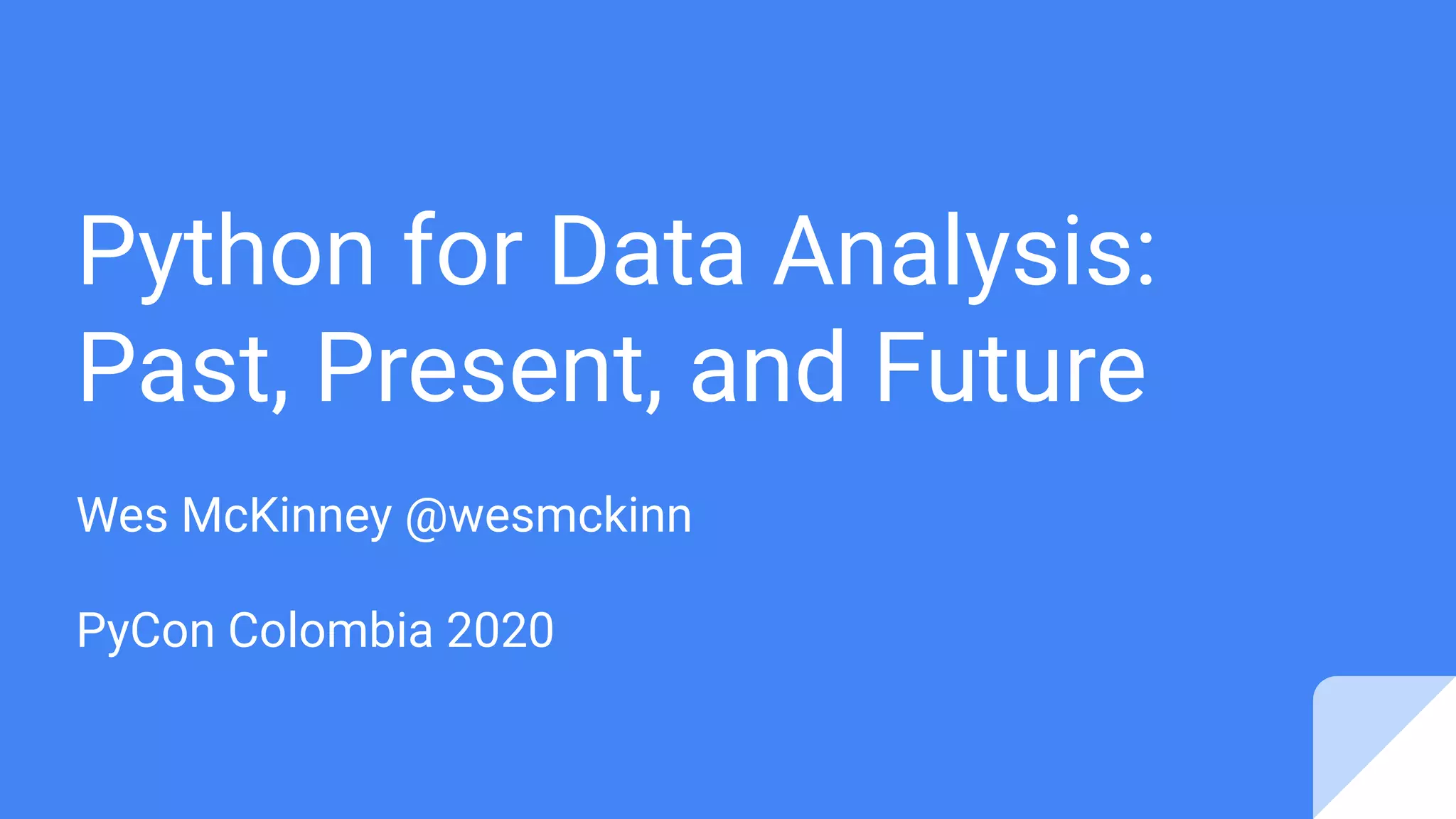 Wes McKinney gave a presentation on the past, present, and future of Python for data analysis. He discussed the origins and development of pandas over the past 12 years from the first open source release in 2009 to the current state. Key points included pandas receiving its first formal funding in 2019, its large community of contributors, and factors driving Python's growth for data science like its package ecosystem and education. McKinney also addressed early concerns about Python and looked to the future, highlighting projects like Apache Arrow that aim to improve performance and interoperability.