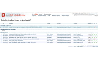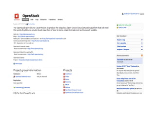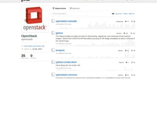 The document outlines the components and architecture of OpenStack, detailing the contributions and release history of the project since its formation in 2010. It describes various OpenStack services such as Nova for compute, Swift for object storage, and Glance for image management, along with the development and contribution processes. Additionally, it provides guidance for developers on how to contribute to the project, including steps for fixing bugs and submitting code changes.