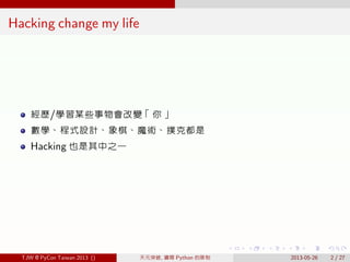 TJW @ PyCon Taiwan 2013 () 天元突破, 鑽開 Python 的限制 2013-05-26 6 / 27