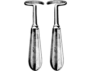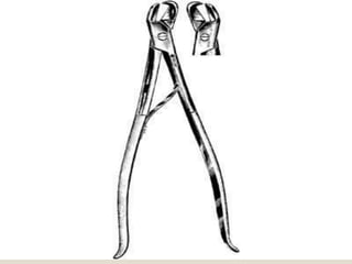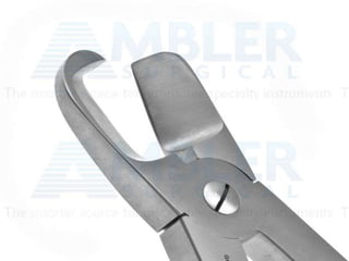 This document describes various surgical instruments used in procedures to remove kidney stones (nephrolithotomy), ureter stones (ureterolithotomy), and pelvis stones (pyelolithotomy). It lists the instruments in the tray, including forceps, retractors, scissors, and drainage tubes. Descriptions of key instruments are provided, such as Randall's renal calculus forceps for grasping stones, Gil-Vernet's retractor for accessing the renal pelvis, and Coryllos-Bethune rib shears for opening the chest cavity.