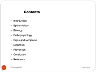 Pyelonephritis is an infection and inflammation of the kidneys that is usually caused by bacteria ascending from the lower urinary tract. It is more common in females than males, especially between ages 15-35. Common symptoms include flank pain, fever, nausea, and urinary symptoms like dysuria and hematuria. Diagnosis involves urinalysis showing white blood cells and a urine culture. Treatment focuses on antibiotics and prevention emphasizes frequent urination and hydration to maintain bladder health.