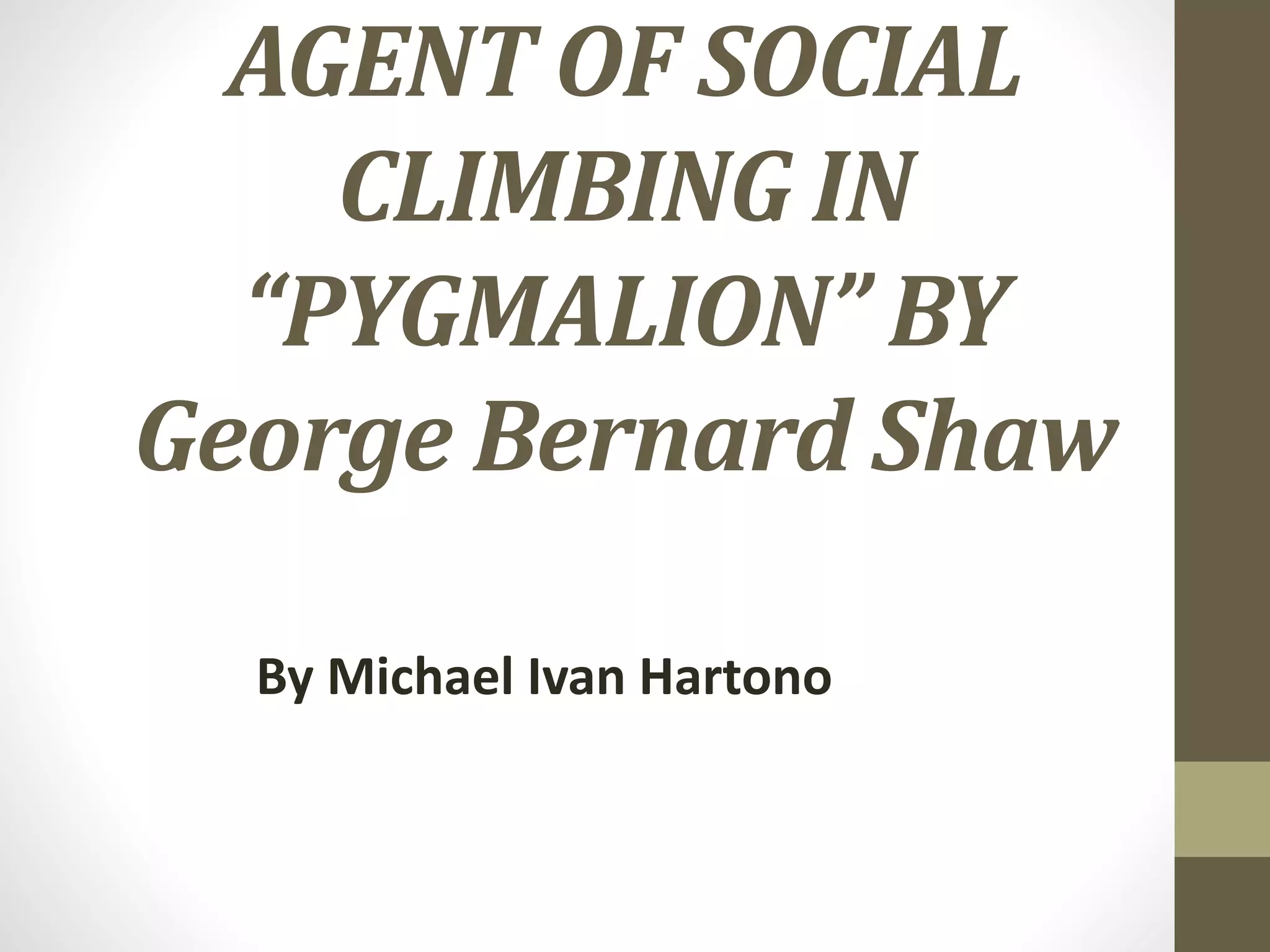 The document analyzes the role of education as a means of social mobility in George Bernard Shaw's play 'Pygmalion,' focusing on the transformation of Eliza Doolittle from a flower girl to a refined lady. Through close reading, the study emphasizes how education shapes societal perceptions and individuals' statuses, concluding that improved education affects people's attitudes toward Eliza. The research also highlights the significance of Eliza's journey and the changes in her speech and behavior as a reflection of her educational growth.