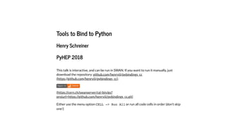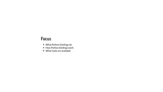 This document discusses tools for binding C/C++ code to Python. It begins with an overview of ctypes and CFFI for pure C bindings, and how CPython implements bindings internally. It then covers popular binding tools like SWIG, Cython, and Pybind11. For SWIG, a simple example is shown generating bindings for a C++ class. Later, a more detailed example is demonstrated using Pybind11 to bind the Minuit2 optimization library to Python.