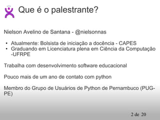 O documento apresenta o Pyjamas, uma ferramenta que permite desenvolver aplicações web em Python, inspirada no Google Web Toolkit (GWT). Discute as vantagens do uso de AJAX em comparação com a arquitetura web clássica, além de descrever como o Pyjamas simplifica o desenvolvimento ao traduzir código Python para JavaScript. Inclui também informações sobre instalação e recursos do Pyjamas, como manipulação de DOM e tratamento de exceções.