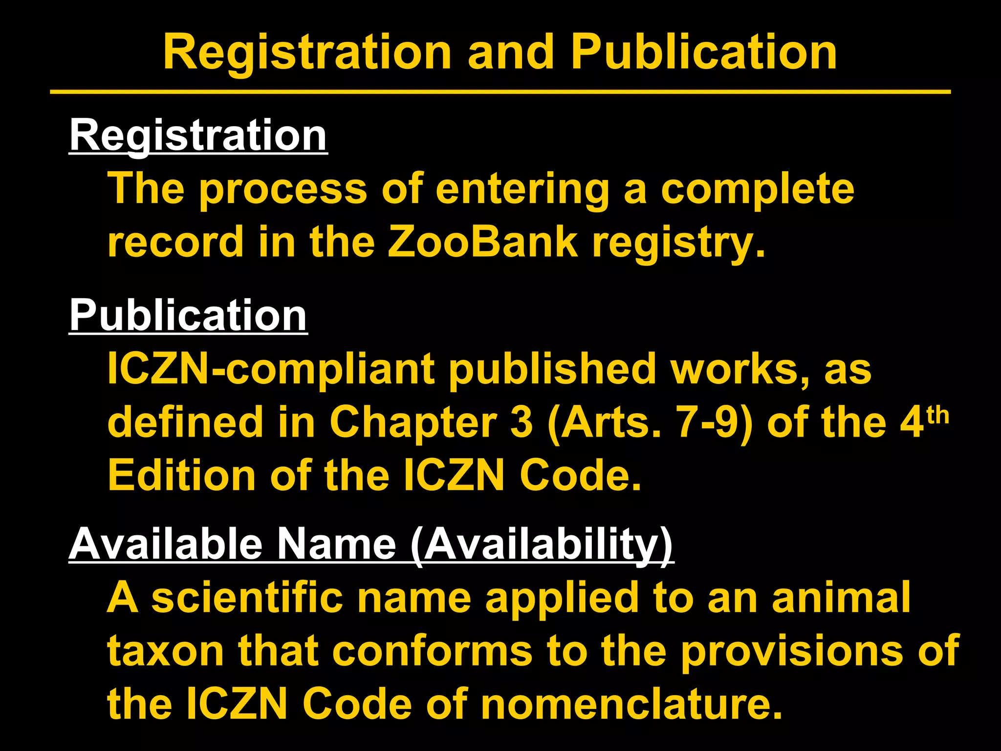 1. Publication + Registration = Availability. Names must be published according to ICZN rules and registered. Registration can occur before or after publication.