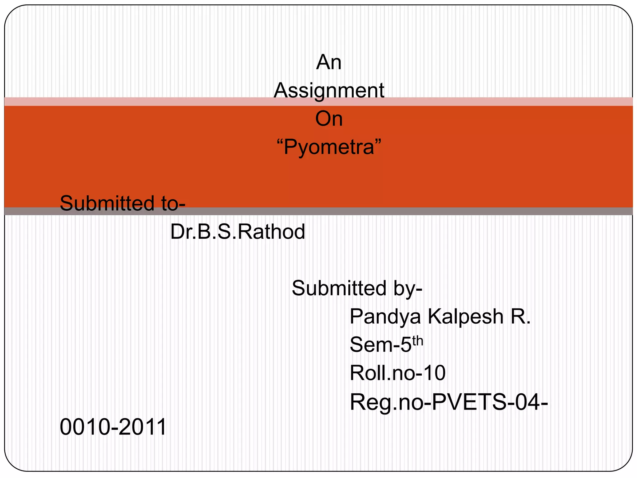 This document summarizes information about pyometra, an infection of the uterus that results in pus accumulation. It defines pyometra and classifies it as either open or closed. Open pyometra involves a discharge from the vagina while closed pyometra does not. Common causes are hormonal and structural changes to the uterus from aging and heat cycles. Symptoms can include vomiting, loss of appetite, and fever. Diagnosis involves blood tests, x-rays, and ultrasounds. Treatment is usually a surgical removal of the uterus and ovaries, while in some cases prostaglandins may be used to medically treat the condition in valuable breeding animals. Prevention involves early spaying of pets.