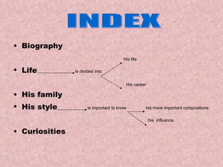 Pyotr Ilyich Tchaikovsky was a Russian composer born in 1840 who wrote some of the most popular classical music. He composed many famous works including Swan Lake, The Nutcracker, and 1812 Overture. Tchaikovsky was born into a middle class family and received music lessons from an early age. He had a successful career as a composer and professor of music in Saint Petersburg, but his personal life was complicated by his sexuality in a time when homosexuality was stigmatized. Tchaikovsky died in 1893 at the age of 53 from cholera, though some historians believe his death may have been a suicide.