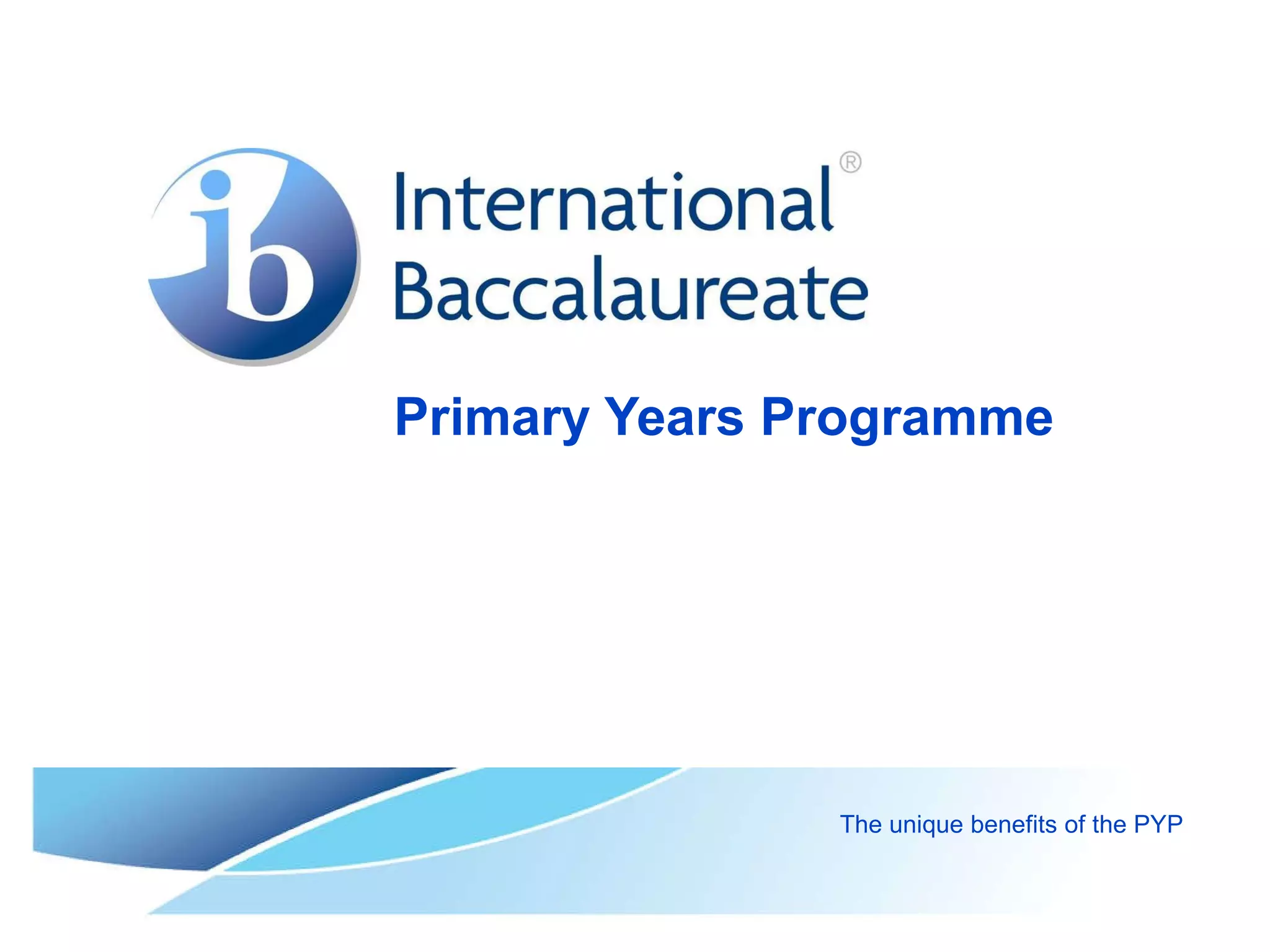 The document provides an overview of the Primary Years Programme (PYP) from the International Baccalaureate (IB). It describes the PYP curriculum model which focuses on developing the whole child through six transdisciplinary themes explored using six subject areas and transdisciplinary skills. The essential elements of the PYP curriculum are knowledge, concepts, skills, attitudes, and action. Assessment in the PYP aims to provide feedback on the learning process and involves students and teachers.