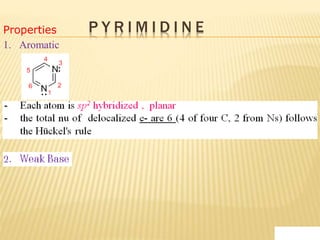 This document discusses properties, synthesis, and reactions of pyrimidine. It was authored by Dr. Gurumeet C Wadhawa of the Department of Chemistry at Karmaveer Bhaurao Patil College in Vashi, Navi Mumbai, India. The document covers pyrimidine's aromatic properties, methods of synthesis from 1,3-dicarbonyl compounds and α,β-unsaturated ketones, and examples of electrophilic addition, electrophilic aromatic substitution, and nucleophilic substitution reactions. Medicinal uses of pyrimidine are also mentioned.