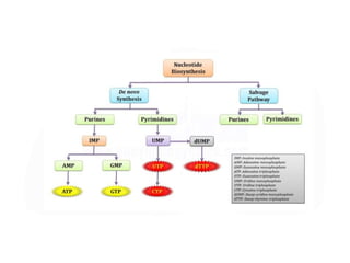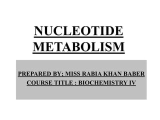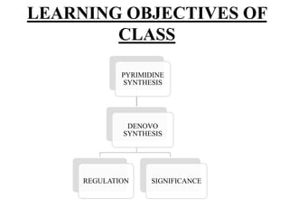 The document discusses nucleotide metabolism, specifically focusing on pyrimidine synthesis, including de novo synthesis and the salvage pathway, and highlights the key substrates and products involved in this process. It details the steps of pyrimidine synthesis from carbamoyl phosphate and aspartate, clarifying enzymatic actions and regulatory mechanisms. The significance of pyrimidines is also noted, as they play crucial roles in DNA and RNA synthesis, as well as various biological activities.