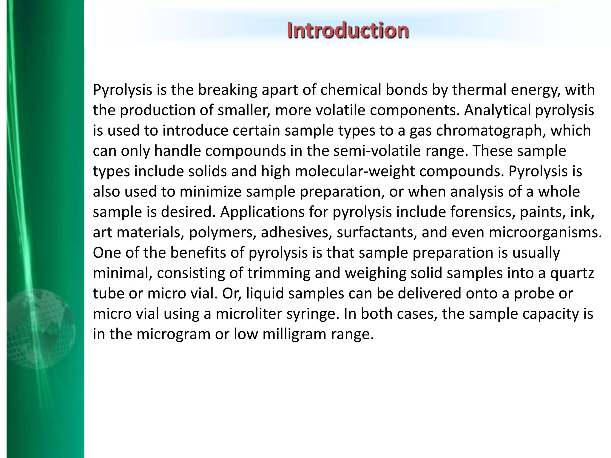 Pyrolysis is the breaking apart of chemical bonds through thermal energy. Analytical pyrolysis introduces solid and high molecular weight samples to a gas chromatograph by breaking them down. It is used to minimize sample preparation and analyze whole samples. Applications include forensics, polymers, and microorganisms. Samples are placed in a quartz tube or vial and pyrolyzed. Liquid samples can also be injected and pyrolyzed. The OPTIC inlet allows for fast, high temperature pyrolysis for both solid and liquid samples.