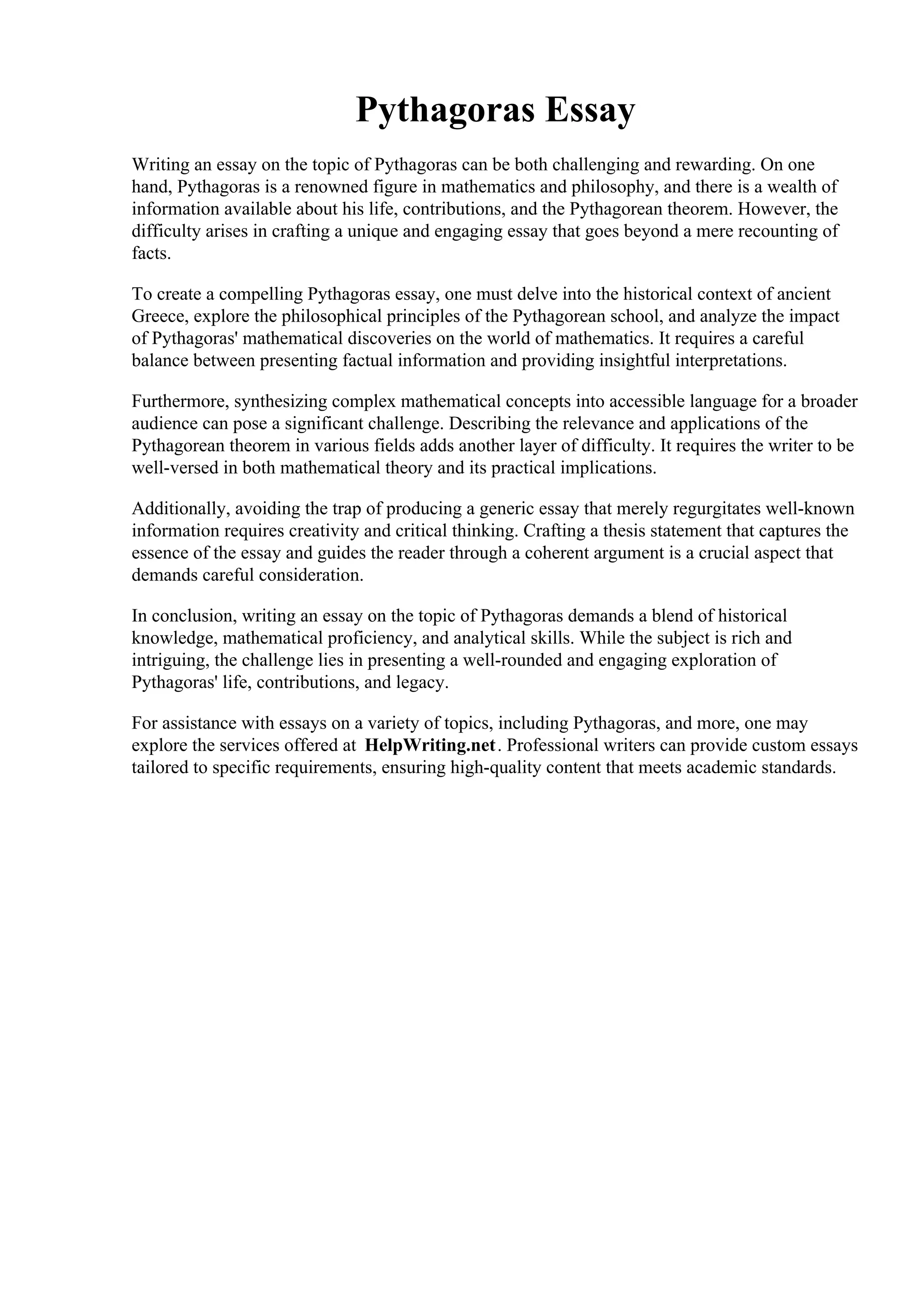 The document discusses the complexities of writing an essay on Pythagoras, highlighting the need for historical context, philosophical exploration, and the synthesis of mathematical concepts in an engaging manner. It also mentions the challenges faced in writing essays on various topics, emphasizing creativity and critical thinking. Additionally, it offers a brief overview of professional writing services available to assist students in achieving high-quality academic content.