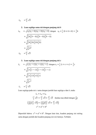Dokumen ini membuktikan teorema Pythagoras dengan menggunakan luas segitiga sama sisi yang terbentuk dari masing-masing sisi segitiga siku-siku. Luas segitiga pada hipotenusa sama dengan jumlah luas segitiga pada dua sisi lainnya, sehingga diperoleh bahwa kuadrat panjang hipotenusa sama dengan jumlah kuadrat panjang dua sisi lainnya.