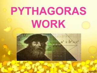 The document provides a comprehensive overview of Pythagoras, a pivotal figure in mathematics and philosophy, detailing his life, travels, teachings, and contributions, including the Pythagorean theorem and his theories on music and the universe. It highlights the establishment of the Pythagorean school and its principles, emphasizing their belief that 'all is number' and their strict code of conduct. Additionally, the document discusses various mathematical concepts related to Pythagoras, such as perfect and amicable numbers, as well as the enduring influence of his work in modern mathematics.