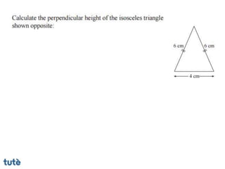 This document discusses how to apply Pythagoras' theorem to calculate distances and lengths in triangles, both right-angled and non-right angled. It provides examples of using the theorem to solve examination questions involving finding lengths, areas, perimeters, volumes, and calculating how much water a tank can hold.