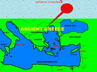 This document provides an overview of Pythagoras and the Pythagorean theorem. It discusses Pythagoras' life and the Pythagorean order he founded, which studied mathematics, music, and astronomy. It then explains the Pythagorean theorem, which relates the sides of a right triangle, and provides examples of how to use it to find missing side lengths. The document also discusses other types of triangles and Pythagoras' important contributions to geometry and the understanding that the Earth revolves around the sun.
