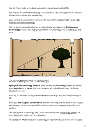 The document provides an overview of Pythagorean numerology, which posits that numbers influence human lives and personality traits based on one's birth date and name. It explains the significance of six core numbers derived from these factors that help individuals understand their life path, talents, and how they are perceived by others. The document also touches on master numbers (11, 22, 33) and emphasizes the need for a deeper interpretation of numerological data for personal empowerment.