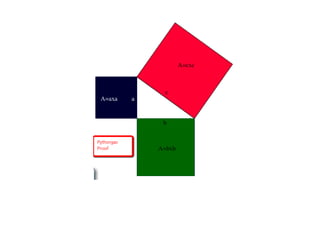 This document provides instruction on using the Pythagorean theorem to solve for unknown sides of right triangles. It defines key terms like hypotenuse and legs, shows the Pythagorean theorem formula, and provides examples of using it to find the length of unknown sides. Historical context is given about Pythagoras and that other ancient cultures also understood this relationship between triangle sides. Word problems are worked through as practice applications of the theorem.