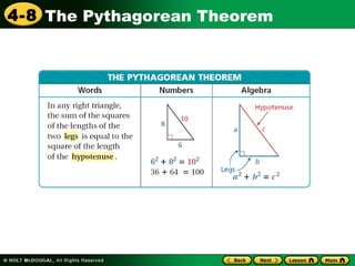 The document provides a lesson on the Pythagorean theorem. It includes examples of using the theorem to find the length of hypotenuses and legs of right triangles. It also gives practice problems and their step-by-step solutions. The document aims to teach students how to apply the Pythagorean theorem to solve problems involving right triangles.
