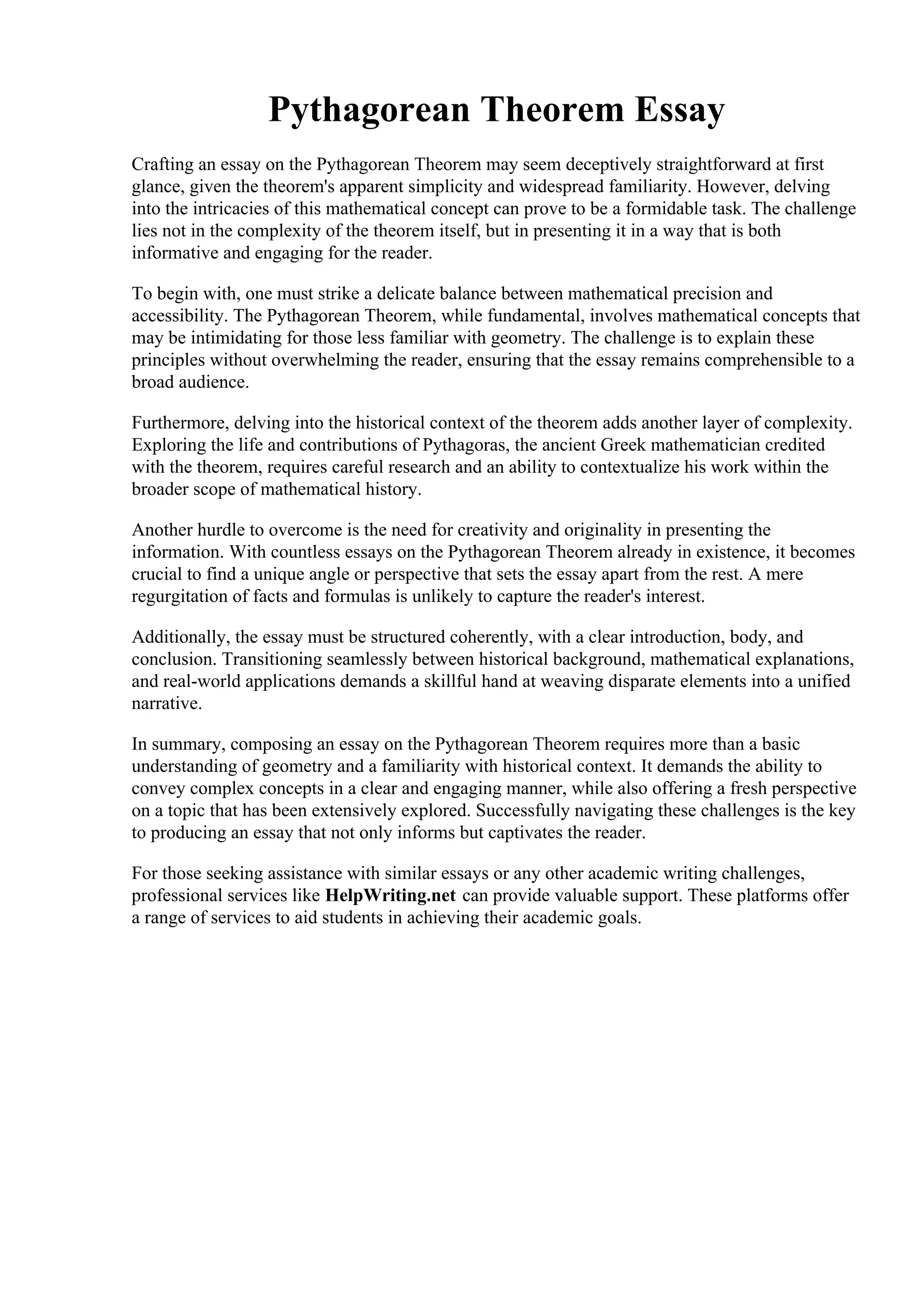 The document discusses the challenges of crafting an engaging and informative essay on the Pythagorean theorem. It emphasizes the need for a balance between mathematical precision and accessibility, as well as the importance of incorporating historical context and originality in presentation. Ultimately, the ability to clearly convey complex concepts while captivating the reader is crucial for a successful essay.