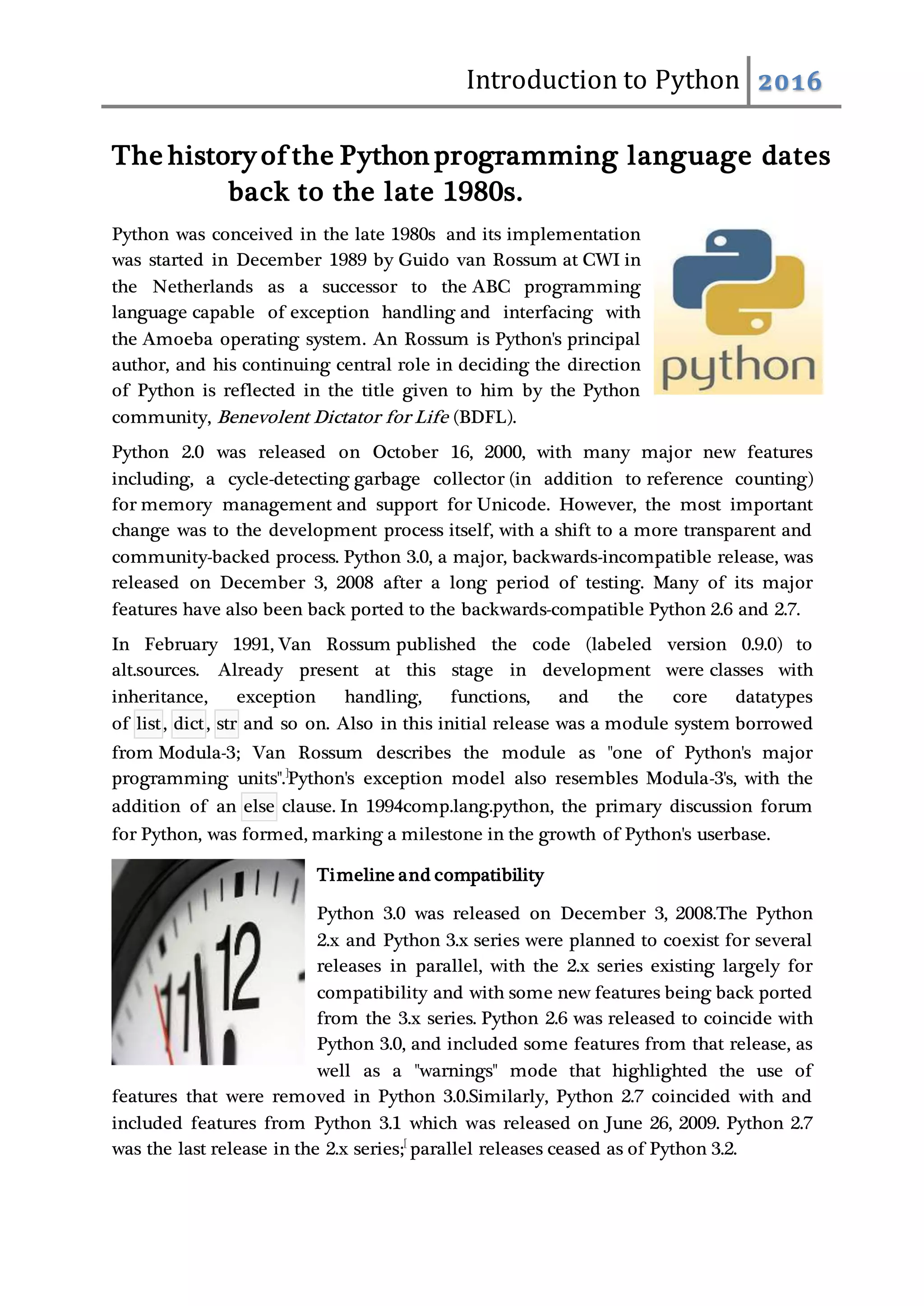 Python was created by Guido van Rossum in 1989 at CWI in the Netherlands as a successor to the ABC language. It was influenced by languages like Modula-3 and C. Major releases include Python 2.0 in 2000 which included a garbage collector and support for Unicode, and Python 3.0 in 2008 which was a major backwards incompatible release.