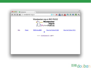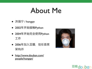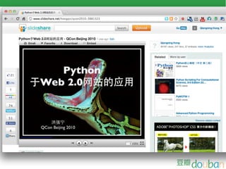 This document discusses Python technologies used at Douban. It describes how Python is used for web development, including frameworks like Quixote and tools like Mako templates. It also discusses using Python for system tasks like caching with cmemcached, profiling code, and interacting with databases. Overall Python allows Douban to build scalable web applications and services.