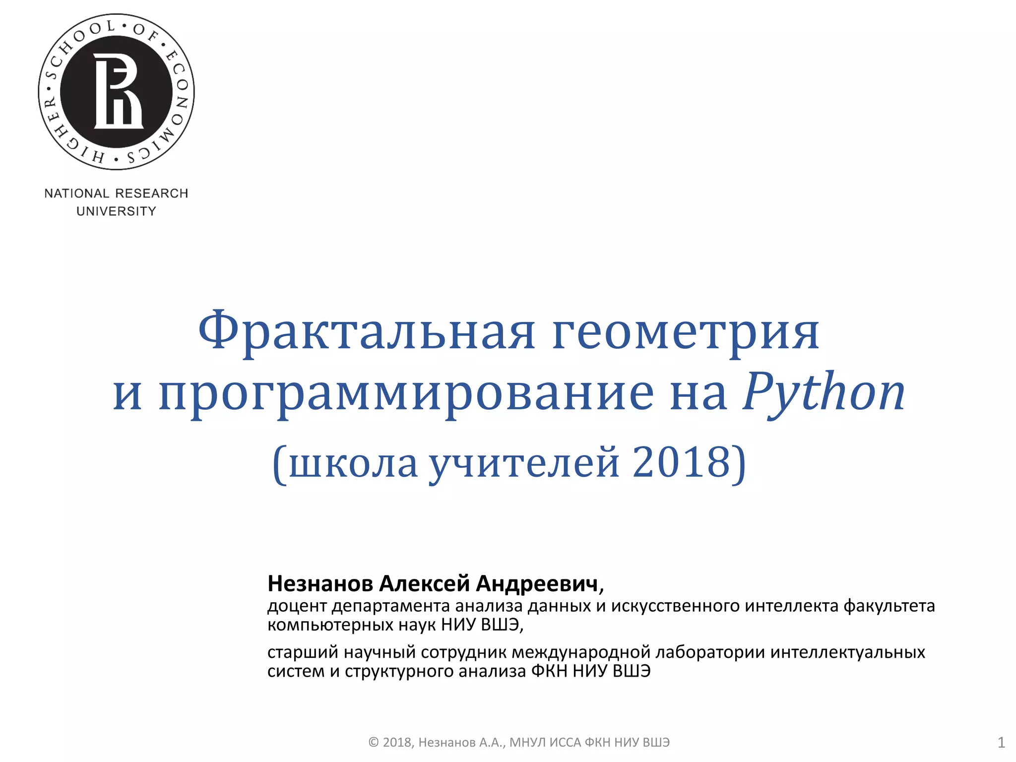 Документ представляет собой учебный материал по фрактальной геометрии и программированию на Python, описывающий различные типы фракталов и их визуализацию. Он охватывает теоретические аспекты, такие как определения, примеры и парадоксы, а также практическое применение фракталов в программировании и графике. Рассматриваются фракталы как в математическом, так и в художественном контексте, включая алгоритмы и библиотеки Python для их генерации.