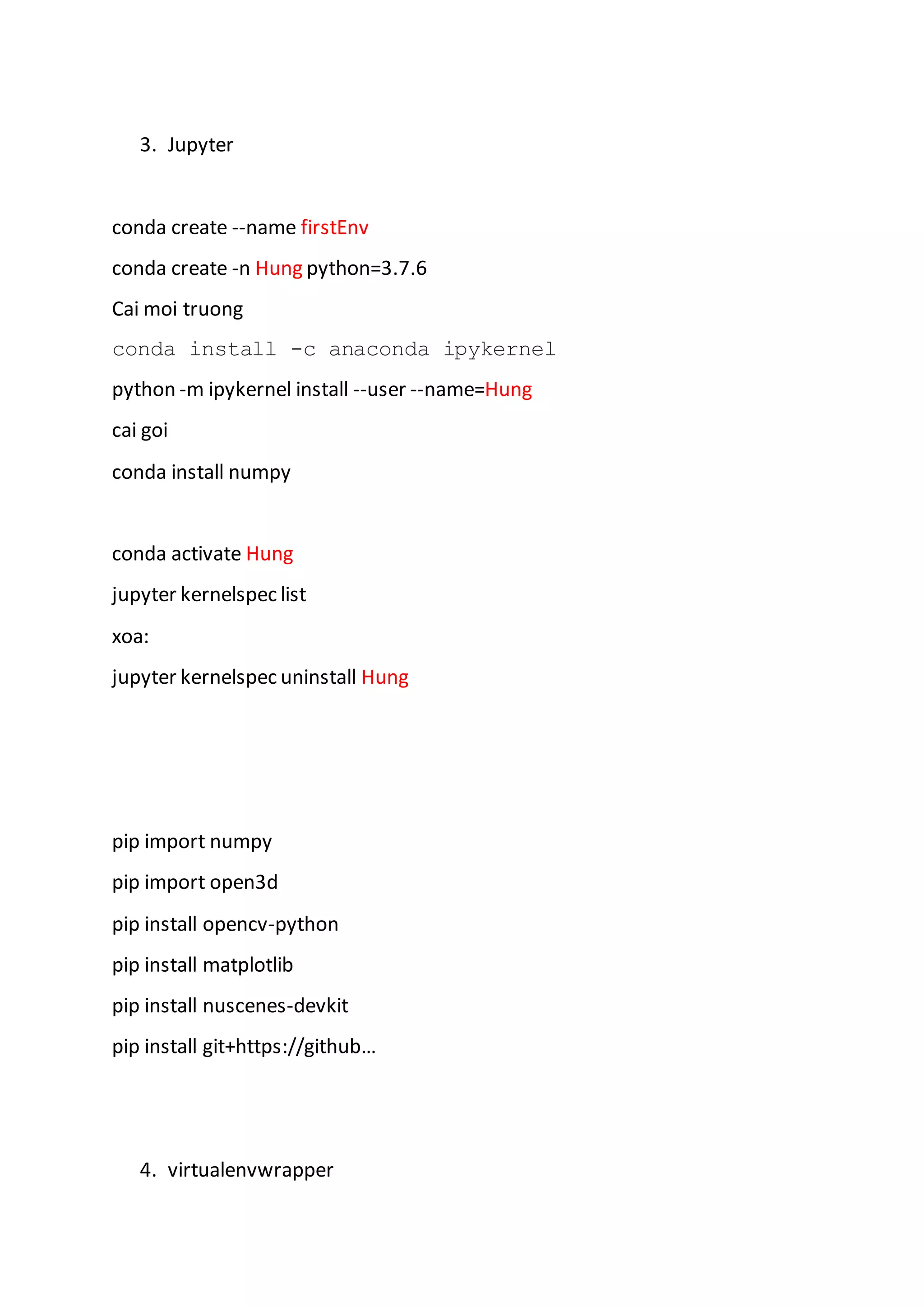 1. This document provides instructions on installing various Python packages and environments including NumPy, Conda, Jupyter, virtualenvwrapper, and Google Colab.