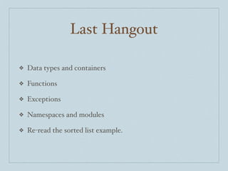 The document outlines topics covered in a Python hangout session including data types, functions, exceptions, namespaces, and file handling. It discusses functional programming concepts such as higher order functions, anonymous functions, and decorators, as well as advanced iteration techniques like list comprehension and generator expressions. Key points also include managing file operations and command-line options using optparse.
