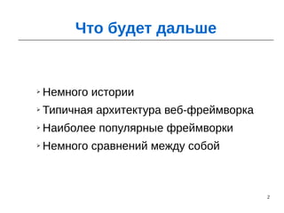 Документ представляет собой обзор различных веб-фреймворков, включая их историю, популярные примеры, такие как Django и Flask, а также описывает типичную архитектуру и ключевые компоненты фреймворков. Автор делится личным мнением о качестве документации, поддержке и популярности различных фреймворков. В документе также приведены примеры кода для простейших приложений на нескольких фреймворках.