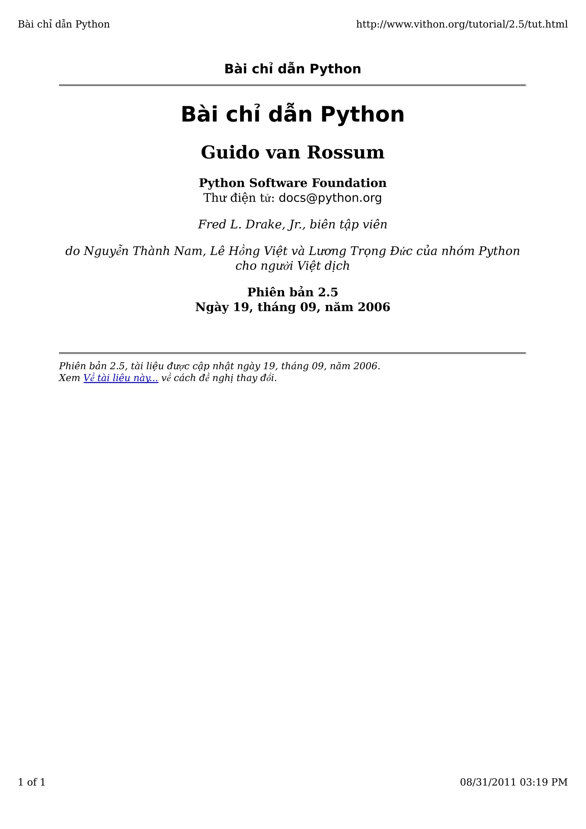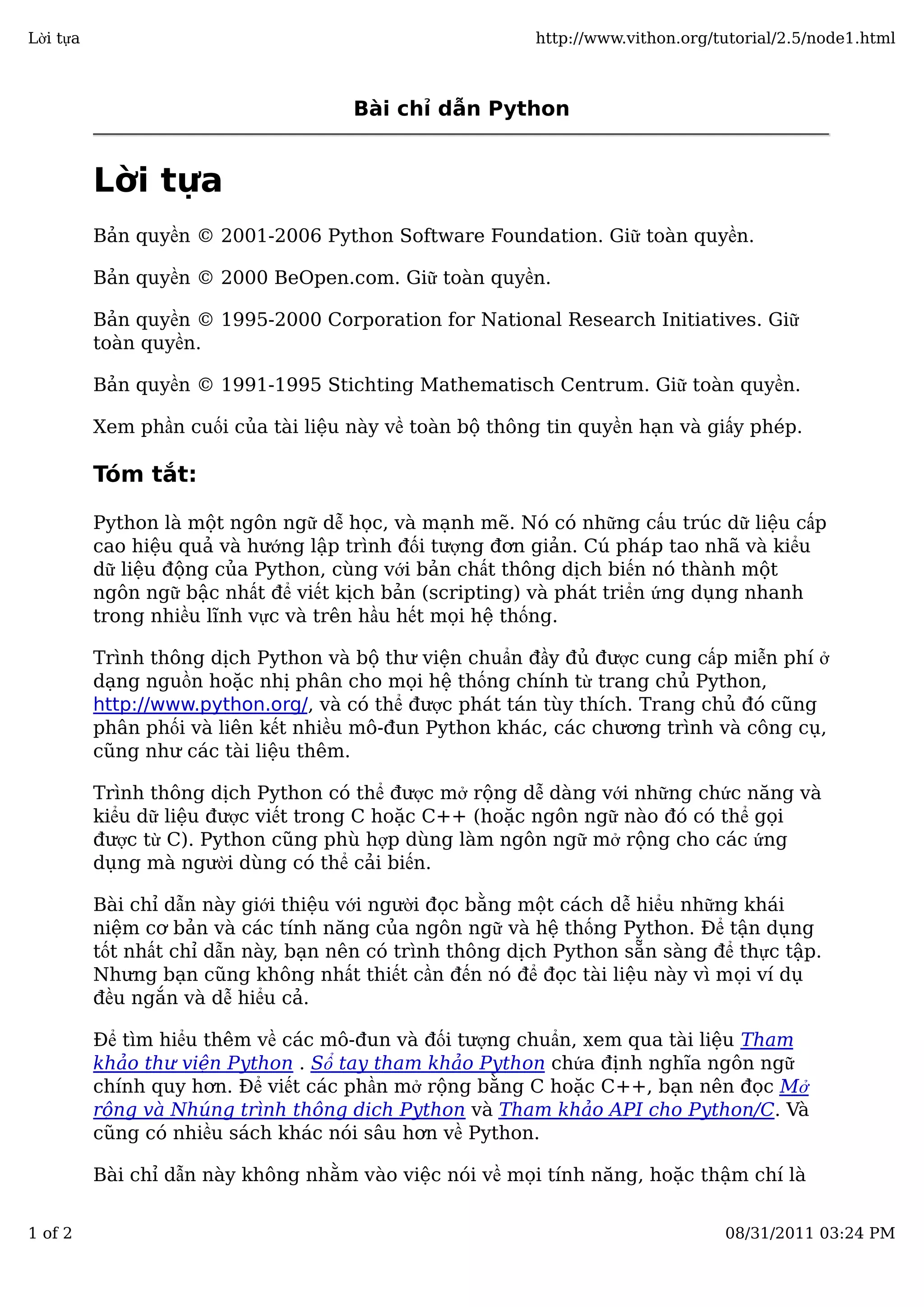 Tài liệu hướng dẫn Python phiên bản 2.5 cung cấp cái nhìn tổng quan về Python, nhấn mạnh tính dễ học, cấu trúc dữ liệu cấp cao và khả năng mở rộng của ngôn ngữ này. Nó giới thiệu về cú pháp, cách sử dụng trình thông dịch, cùng với các khái niệm cơ bản giúp người đọc có thể viết và hiểu các chương trình Python. Tài liệu cũng gợi ý về việc thực hành với trình thông dịch để nắm vững các tính năng của Python.