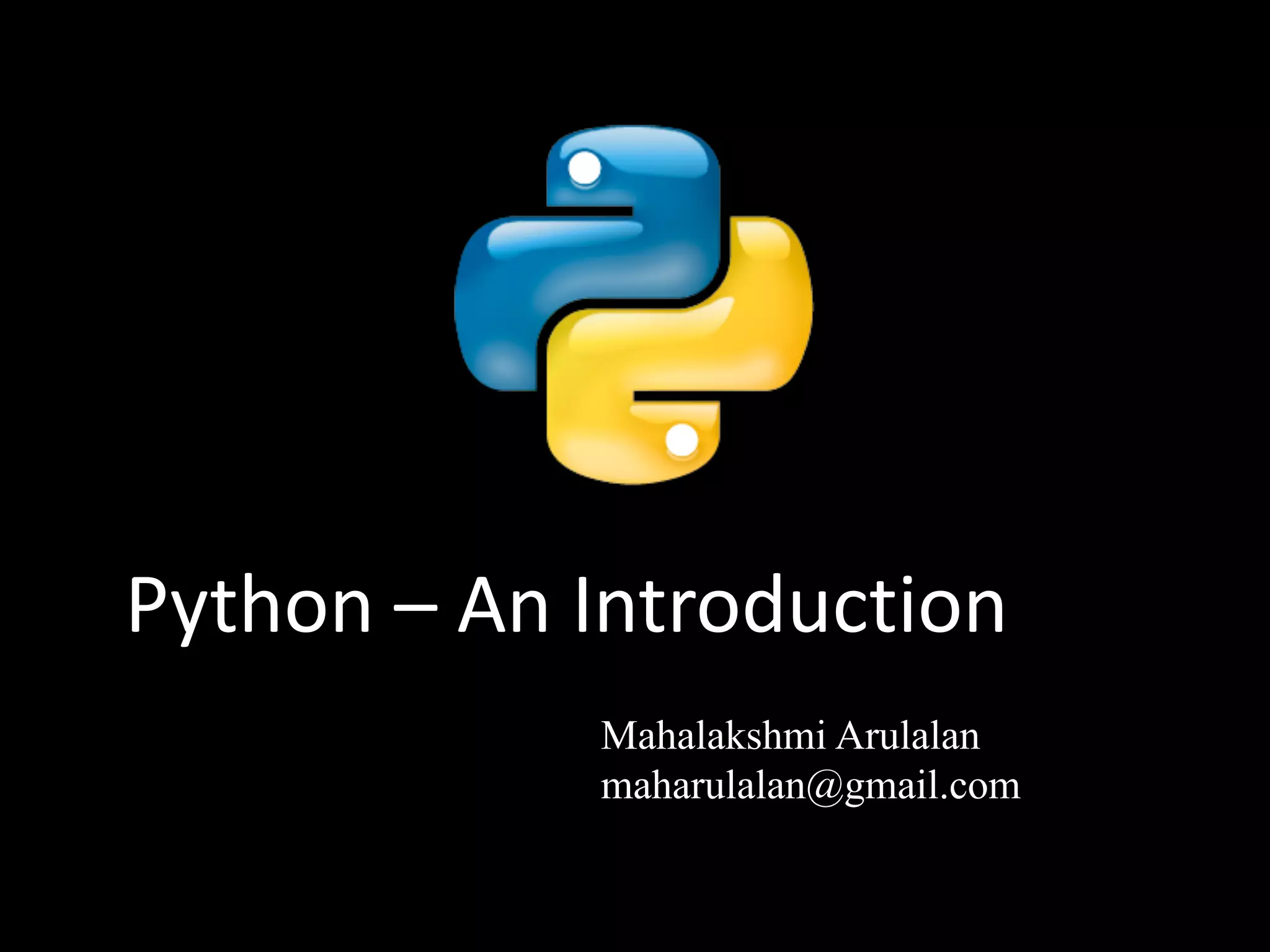 Python is a simple yet powerful programming language that can be used for a wide range of applications. It has an easy to read syntax and is free and open source. Python code is interpreted at runtime and variable types are automatically determined. Python supports object oriented programming concepts like classes, inheritance and modules. It can be used for tasks like text processing, web development, scientific computing, and more. Guido van Rossum created Python in 1991, building upon languages like Perl and Java.