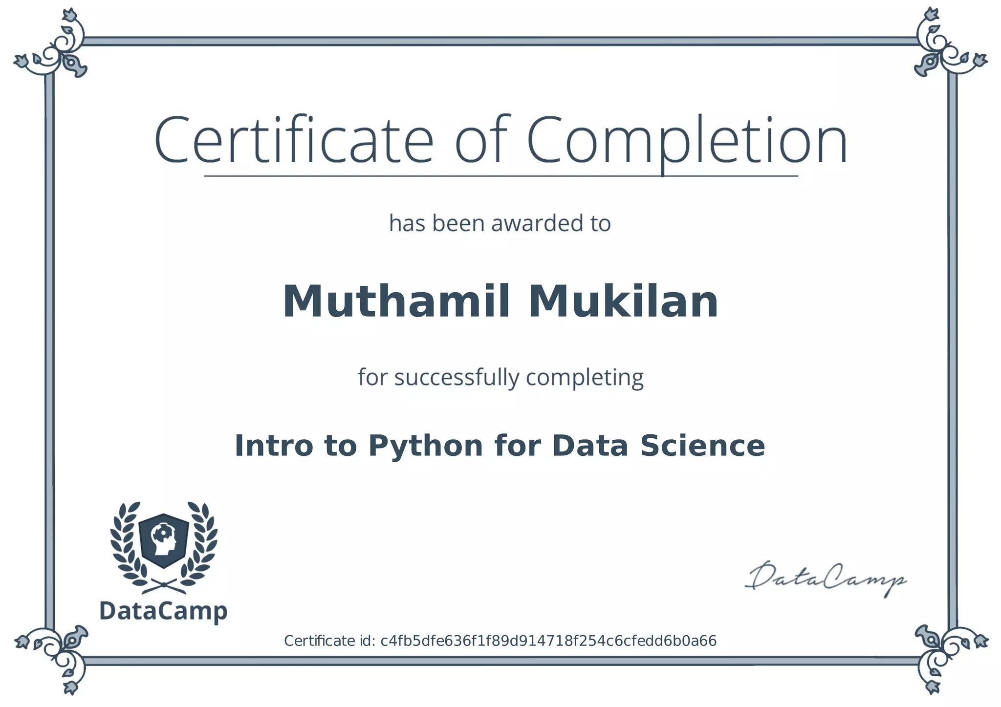 This document provides a certificate for Muthamil Mukilan who completed an introductory course in Python for Data Science. The certificate id is listed as c4fb5dfe636f1f89d914718f254c6cfedd6b0a66.