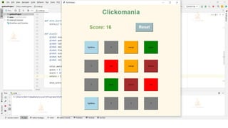 The document describes a Python click-o-mania game project that contains 16 gray boxes and the player has 25 turns to activate boxes by clicking on them. It explains the prerequisites of basic Python knowledge and Tkinter GUI skills. The steps to create the game are outlined, including importing modules, making a window, defining functions, and the main game loop. The output shows a successful Python click-o-mania game was developed using these techniques.