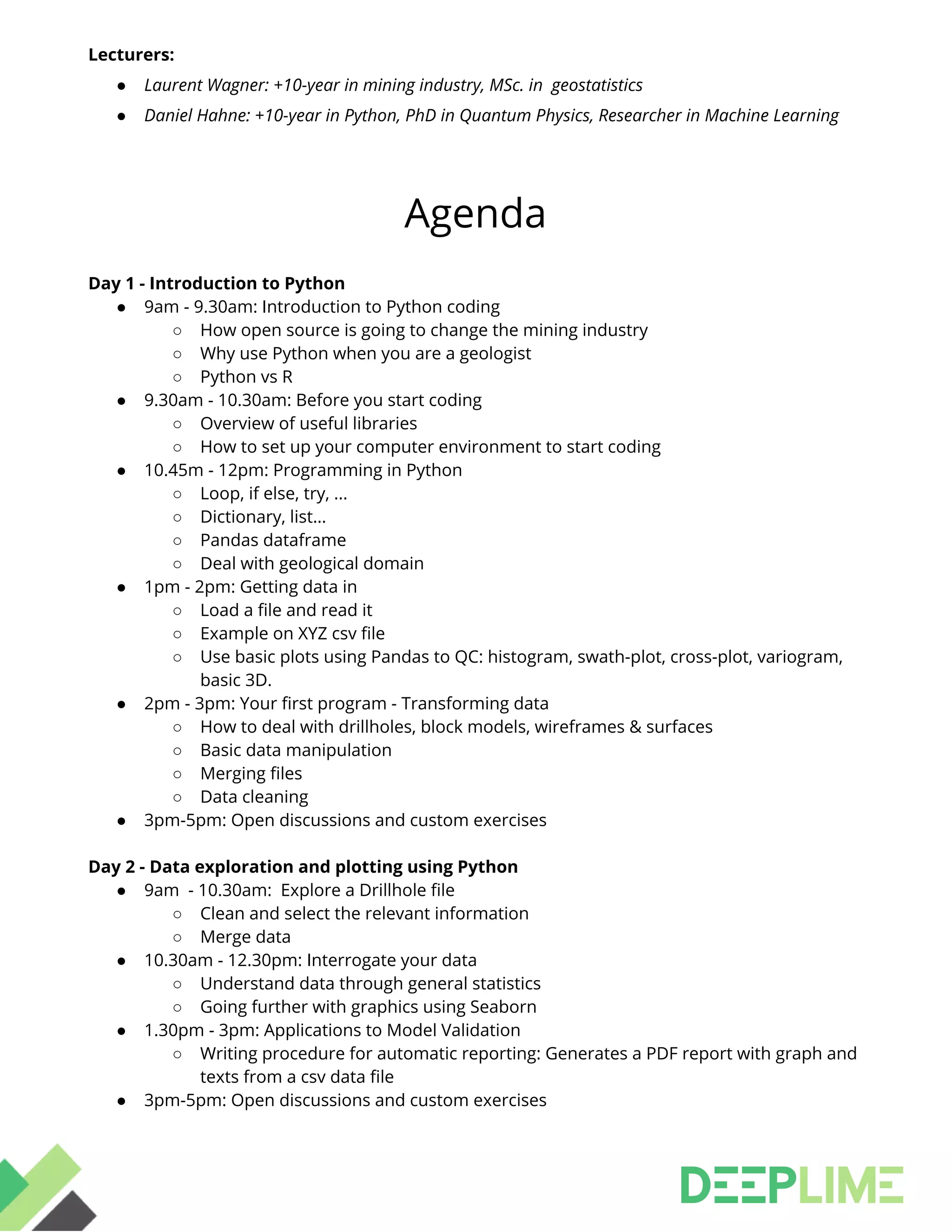 The two-day workshop will provide an introduction to using Python for geological data analysis. Over the course of the workshop, participants will learn how to set up a Python environment, perform basic coding, import and manipulate geological data like drillholes, block models and surfaces, generate custom graphics, and write procedures to automate reporting tasks. The workshop is designed for geologists, mining engineers, and managers who want to leverage open source tools like Python. No coding experience is required, but participants should have experience in geology.